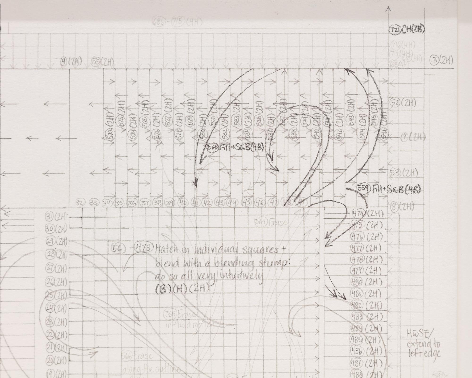 Kim’s notational system draws on the Fluxus score tradition, where instruction and image collapse into one another. But where Fluxus instructions are written to be performed by others, Kim’s system is inherently non-transferable to the viewer. Instead, her instructional renderings expose a choreography of mourning no one else can perform.